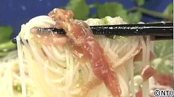そうめんを硬めに茹でます。(※今回は本来3分30秒茹でるものを1分30秒茹でました)茹で上がったら流水で流し、氷水で冷やします。水気を切り、なたね油と白梅酢と和えます。
