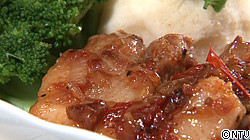 平皿に豚肉を盛り付け、ソースをかけます。ブロッコリー、マッシュポテトを添え、生バジルを飾ったら出来上がりです。