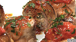 フライパンを熱し、オリーブオイルを加え、輪切りにした唐辛子で香りを出します。(6)で出た肉汁を漉しながら加え、少し煮詰めます。ざく切りしたトマトを加え、軽く火が通ったら、トマトジュースを加え、お好みで塩で味を調えます。