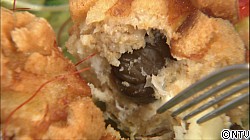 (1)の半量を更に3等分にし、中にクリームチーズと甘栗を入れて丸めます。まわりに(2)の食パンをつけて揚げます。