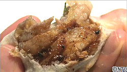 チュンピンにみそをぬり、豚肉や野菜などを包んで頂きます。