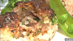 炊きあがったご飯にクレソンを加え混ぜ、丸くおにぎりにします。片面に(6)をのせ表面に焼き色が付くようにオーブンで焼き、(5)と共に平皿に盛り付けます。