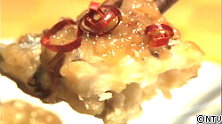 太刀魚の尻尾部分の水気を取り除き、素揚げします。外側がパリパリになったら、油から取り出し、すぐに(3)に入れ、タレを絡めて平皿に盛り付けます。