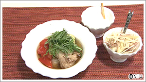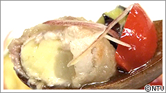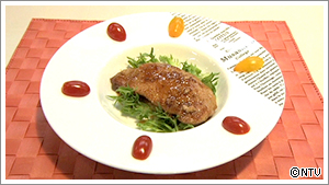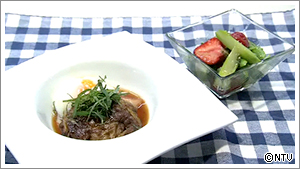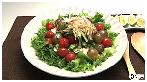 初戦の準々決勝。テーマは「高齢化時代にピッタリ!未来の料理」。4人中3人が豆腐料理などで挑戦する中、大本さんが作ったレシピは五感(食感、味、香り、音)を刺激する「つるん、ころん、楽しサラダ☆」。年配者の食事は冷たすぎても熱すぎてもダメ。程よい温度のささみのサラダに、コロコロのトマトや巨峰など組み合わせた、見た目にも楽しい一品を完成。みごと準決勝への切符を手に入れました。