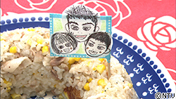 一方、大本さんは、『くるくるトンカツ~オニバタソース~と、とうもろこしご飯のセット』。3人のお子さん、またご主人の大好きなトンカツのアレンジです。特にお子さんが大好きな味付け海苔と甘い卵焼きを、豚肉でくるっと巻いて、パン粉でカラッと揚げました。そしてとうもろこしご飯の仕上げには…ご主人お手製、お子さんたちの顔を描いた旗を飾り完成しました!