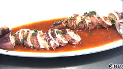 イカを取り出し、頭の方から切り分けます。皿に盛り付け、ソースを上からまんべんなくかけたら出来上がりです。