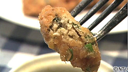 大葉を刻み、れんこん、しょうがをすりおろします。鶏ひき肉、塩、こしょう、泡立てた卵白を加え、混ぜ合わせます。さらに黄身を入れて粘りが出るまでよく練り合わせます。(※れんこんは水気をきって加えてください。)