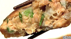 鮭の皮と骨を取り除き、身は細かくみじん切りにして(3)のボウルに入れます。