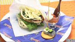 くねくねうどんの鶏つくねバーガーを仕上げます。(7)のうどんを一番下にして、サラダ菜と大葉を重ねたら、つくねをのせます。これに卵黄を塗り、大葉をのせたらマヨネーズを絞り、うどんで挟んだら出来上がりです。これを4つ作り、食べ易いようにバーガー袋に入れます。これでバーガーの完成です。