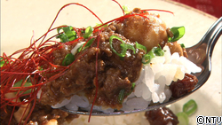 器にご飯、カレーを盛り、砕いたピーナッツ、ねぎ、糸唐辛子を添えたら出来上がりです。