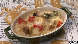 ボウルで3/4量のラタトゥイユとご飯を混ぜて、グラタン皿に入れます。