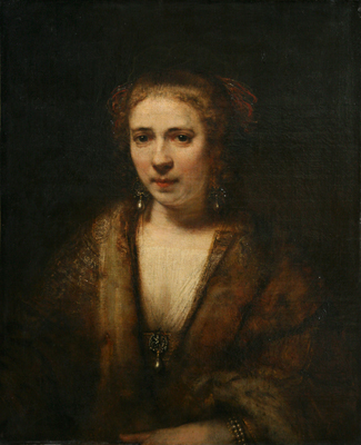 ヘンドリッキェ・ストッフェルスは、レンブラントの事実上の後妻です。レンブラントはヘンドリッキェと入籍することはありませんでした。最初の妻サスキアに先立たれた後、レンブラントは息子ティトゥスの乳母ヘールチェ・ディルクスと愛人関係になり、その後に登場するのがヘンドリッキェです。彼女は1650年代以降のレンブラントのミューズとなり、画家の支えとなりました。実際に彼女の肖像として描かれた可能性は低いものの、著名な《水浴する女》(ロンドン、ナショナル・ギャラリー)や《バテシバ》(ルーヴル美術館)が彼女の存在に大きな想を得たものであり、彼女をモデルにして制作されたことは間違いないでしょう。暗い背景から浮かび上がるように褐色系の諧調を施された彼女は、肩から胸元にかけ、繊細でありながら力強い明暗表現を見せています。