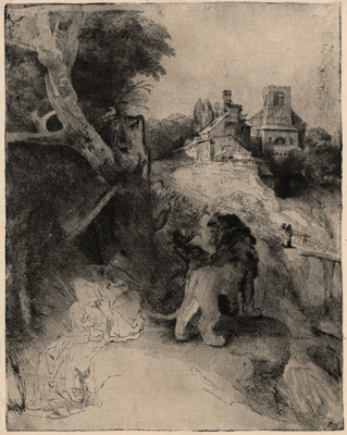 ヒエロニムスはレンブラントが好んだ聖人です。聖ヒエロニムスはしばしばライオンを伴って描かれますが、これは足に棘が刺さって苦しむライオンを救ったことにより聖人の傍には生涯ライオンが付き従ったという逸話からきたものです。木立のそばに描かれるヒエロニムスはライオンに背を向け、柔らかな光に包まれた静寂の風景の中で読書にふけっています。どこかイタリアの風土を連想させる風景は、レンブラントがこの版画を制作するにあたり、カンパニョーラとかティツィアーノなどのヴェネツィア素描を参考にしたことを想像させます。事実、この版画が制作された1650年代前半、レンブラントはカンパニョーラの素描を入手し、自らそこに加筆したことが知られています(レンブラントは生涯、オランダ国外へ出ることはありませんでした)。本展には、西洋紙、和紙、オートミール紙に刷られた3点の作品が出品されます。
