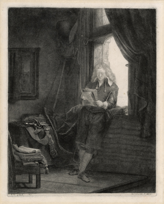 レンブラントによる肖像版画の代表作としてよく知られた本作品は、レンブラントの友人であり、またパトロンでもあったヤン・シックスを描いています。シックスはアムステルダム市長をも勤めた政治家でしたが、同時に、芸術を愛し、詩や戯曲などの著述を残した文人でもありました。おそらく、この作品は、窓の外に広がる社会に背を向け、芸術や文芸の世界で静かに瞑想するシックスの理想像を描いたのでしょう。黒々とした室内の描写は、特に、早い刷りにおいては比類ない美しさに達しています。なお、レンブラントは1654年にはヤン・シックスを油彩画でも描いていますが、それはレンブラントの手になる単独男性肖像画の最高傑作と見なされています。