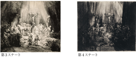 レンブラントの代表作《3本の十字架》は第5ステートまであります。描かれているのは群集を伴うキリスト磔刑の場面です。聖母は失神し、幾人もの人々は中央のキリストに祈りを捧げています。ところが、第4ステートでは異なる場面が表現されました。第3ステートまで見られていた中央のキリストの十字架のすぐ脇にいた馬上の人物は削除され、新たに槍をもった兵士がキリストのほうを向いて描かれました。第3ステートまではキリストが死ぬ瞬間、ないしは死んだ直後の場面が描かれています。だからこそ、画面手前のふたりの人物はキリストに背を向け、事件から遠ざかっていくのです。ところが、第4ステートでは「死にゆくキリスト」、あるいは死ぬ直前のキリスト、「なぜ我を見捨てるのですか」と神に叫ぶキリストの姿を描こうとしたように思われます。