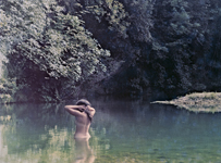 画家ルノワールは人物表現の研究をするなかで、印象主義の原理を適用しようと試みました。そのためにルノワールは色彩を変化させ、光を浴びたモデルの肌に、薄いバラ色から紫色を帯びたバラ色まで、さまざまな色合いの影をちりばめました。ジャンは、自らの作品のなかで、女性の上半身を背後から捉え、父の描いたモデルのように自然と一体化した調和の中においています。水の流れ、陽光が肌に落とす光の斑点、広がる水面に映し出された反映や、光を透過する木々の葉の効果、そしてふたりの芸術家が強い創造意欲をかき立てられたであろうモデルの官能性は、親から子へと受け継がれた芸術性を表しています。