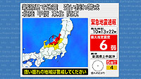「全国どこでも強い揺れ」が予測された場合に、画面全体に速報情報を入れるなどの対応をします。強い揺れが予測される地域が地図で示されるとともに、地震発生時刻、最大推定震度、震源地、揺れの広がりについても速報されます。 |