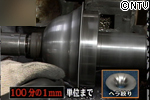 ヘラ絞りという加工方法で、ヘラと呼ばれる金属の棒で、力をかけ、遠心力で金属を伸ばしていく方法です。