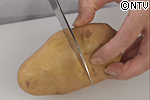 茹でる前の生のジャガイモに1ミリ程度の切り込みを一周入れておきます。