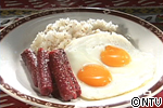 暑さに負けないように栄養たっぷりです。卵料理、ガーリックライス、甘いソーセージにココアを飲む習慣があります。