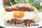 これはメキシコの代表的な朝食です。 トウモロコシを練って焼いて作ったトルティーヤにサルサソースをかけて好きなものをのせて食べます。