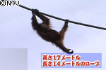 オランウータン館では高さ17メートル、横の長さ14mのロープ渡りが見られるようになっています。時には赤ちゃんをお腹に抱いて渡ることも。