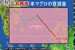本マグロは繁殖力も弱く数が少ない魚です。現在東大西洋では本マグロの数が激減しています。小松先生の予測する計算では、このままいくと2013年にマグロの数はゼロになる可能性があります。