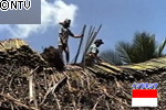 山に住むトラジャ族の特徴は、船の形をした巨大な屋根の住居です。この巨大な屋根は今でも竹をいくつも重ねるという伝統的な作り方をしています。中は大きな屋根の割にはとてもせまい作りになっています。