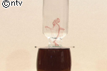 しかし、ワインにつけるとビンの方にワインが入ってきます。これはワインの方が水よりもアルコールが入っている分比重が小さいからです。同時にビンの中の水もワイングラスの方に入っていっています。このままにしておくとワインと水は完全に入れ替わります。