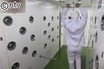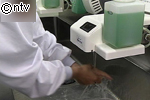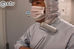 アルコール消毒をします。このアルコール消毒をきちんとしないと、中に入れないようになっている工場もあります。