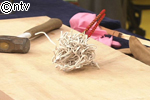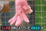 軽く膨らまして液体窒素に入れたゴム手袋は、超低温で冷やされることで弾力が無くなってしまい、強く握ると割れてしまいます。