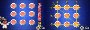 マグロのお寿司が乗った皿が、縦に3皿、横に3皿、斜めに3皿ずつ並んでいます。