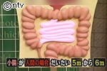 この100兆個を重さにすると10〜1キロ。人間の場合、小腸はおよそ5メートルから6メートル、大腸が1.5メートルくらいあります。ちなみにクジラの小腸大腸は200メートル、ライオンは約8メートルあります。