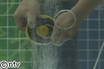空気砲を水中で泡に向かって撃つと丸く空気の輪ができます。