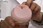 これは、ふってもたおれてもこぼれない、寝たままでも飲めるシリコン製のキャップです。