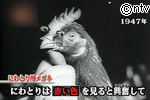 にわとりは赤い色を見ると興奮して攻撃するという習性があります。そこでレンズを赤くするとにわとりには赤い色が赤く見えなくなるので、それを利用してにわとり同士のケンカを防ごうとしました。