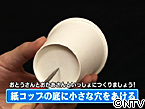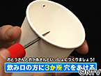 まず、紙コップの底に1カ所、 飲み口のところに3カ所穴を開けます。 そして飲み口のところに開けた穴にひもを通して 2点でつるします。