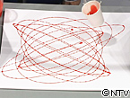 次に底の穴を指で塞ぎながら 絵の具に洗濯のりを混ぜたものを注ぎ、 振り子になるようにコップを離すと 下に模様が出来上がります。 これで描かれる線をリサージュ曲線と言います。