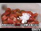角切りにしたトマトに砂糖を振りかけてかき混ぜ、密閉容器に入れて半日ほど冷蔵庫で冷やします。 砂糖には食品の旨味を引き出す効果と砂糖そのものの甘みによって、甘くて美味しい完熟トマトの味になります。