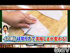 イカの胴体には横向きに筋肉繊維が走っています。 縦切りにするということは筋肉繊維を断ち切るということになります。そうすることで旨味の素であるアミノ酸が出てきやすくなります。また、身の裏側についている薄い膜は縦の繊維なので断ち切られること無く、歯ごたえが残るのです。