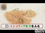 ささみを小さく切り、ラップに挟んで叩きます。 薄くなるまで伸ばしたら、 クッキングシートに移して塩・コショウ・パセリをふります。