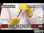 かけた液体はお湯。 一瞬で溶けたナゾとは、47℃という低い温度で溶ける特殊な金属だからです。見た目は普通で固いのですが、お湯に入れると溶け出します。