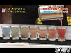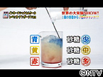 コップの中には3つの違った色の液体が入っていて、これをゆっくり注ぐと3色が混ざって虹色のドリンクになります。 この3色のドリンクはそれぞれ砂糖の濃度が違うので コップの中では混ざりません。