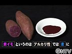 紫イモには、実験などで使われるリトマス試験紙に似た成分が含まれていて、 アルカリ性では青色に、酸性ではピンク色になります。 ホットケーキミックスに含まれるベーキングパウダーがアルカリ性、 シロップが酸性なのでそのような色の変化が起きました。