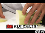余った上の部分を斜めに切り、 とがった部分の切り口を魚に当てると剥がしやすくなります。 大根にウロコが刺さって剥がれるのですが、 大根の水分でウロコ同士がくっつき、飛び散りにくくなります。