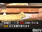 巣箱にいる蜂をしずめるために麻の布を燃やした煙をかけます。 すると蜂は蜜を守ろうとして人間を襲ってこなくなります。 巣にしがみついた蜂はブラシで柔らかくどかします。 ヘラは巣箱に付いている蜜蝋などを削り取ります。 取り出した巣を遠心分離機にかけるとハチミツができてきます。