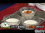 <材料> 牛乳(250cc)、砂糖(30g)、 アーモンドエッセンス(10~15適)、ところてん(150g) あんずのシロップ漬け(適量) <作り方> ・ ところてんを電子レンジ(600W)で約3分間加熱し、 完全に溶かす ・ アーモンドエッセンスと牛乳を加える ・ 器に盛りつけ約2時間冷やす ・ 固まったらあんずを飾り、シロップをかける ※加熱時間は電子レンジの機種によって異なります。