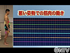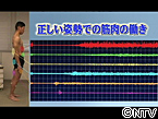 筋肉に流れる電気を測定する事で 筋肉の働きを測る事のできる筋電計を使って、 外腹斜筋・腹直筋・腰腸助筋・ 大臀筋・大腿直筋・大腿二頭筋の 働きを計測し、実験しました。 まずは正しい姿勢で立ってもらうと、 どの部分も正しく筋肉が働いていましたが、 悪い姿勢で立つと、本来使うべき筋肉が 正しく働きませんでした。
