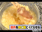 あらかじめ下味を付けた鶏肉を「卵ごはん」にくぐらせます。 後は普通に粉をまぶすだけ!これだけでサクサクになります! その理由は2つで、鶏肉から出る油を卵がコーティングして防ぎ、 さらにご飯を上げると中に空洞ができ、サクサクの衣になるのです。