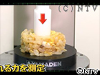 最新計測マシンを使い、チャーハンのかたまりを上から押して、ほぐれるまでにどれだけの力がかかるかを測定!つまり数値が低いほど、パラパラのチャーハンです。